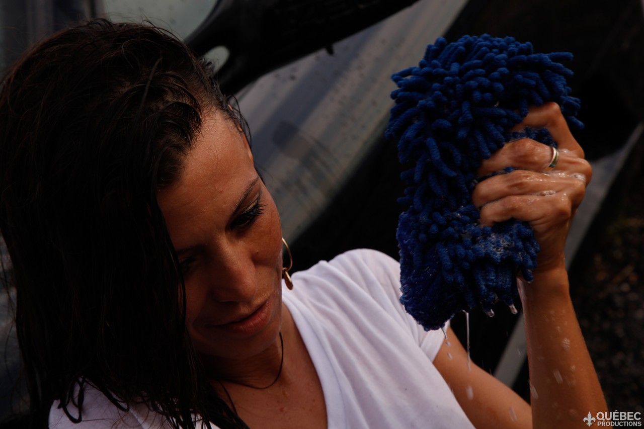 眼鏡をかけた4人の淫乱美熟女ポルノスターが屋外でスポーツカーを洗いながら濡れ、太陽の下でタイトな黒髪ボディをセクシーにポーズして挑発する。