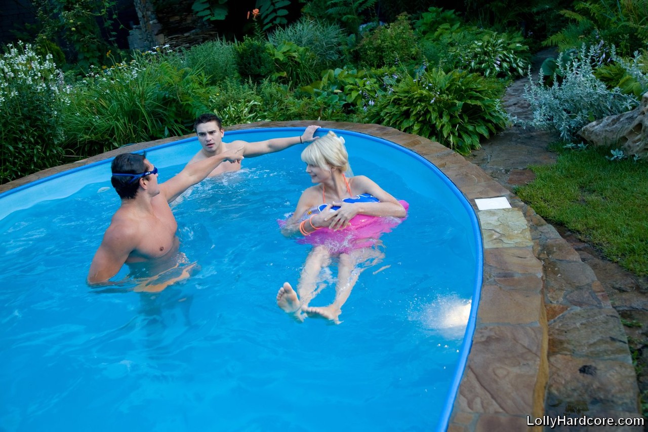 小さな金髪のティーンネイジャーがプールパーティーの後に3人でセックスをする - 写真 5 / 21