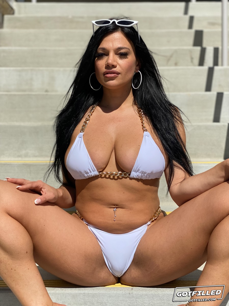グラマーな黒髪美女モナ・アザーがマイクロビキニで誘惑し、人前で股を開いて激ピストン、玉舐めから最後はドロドロ中出しフィニッシュ。