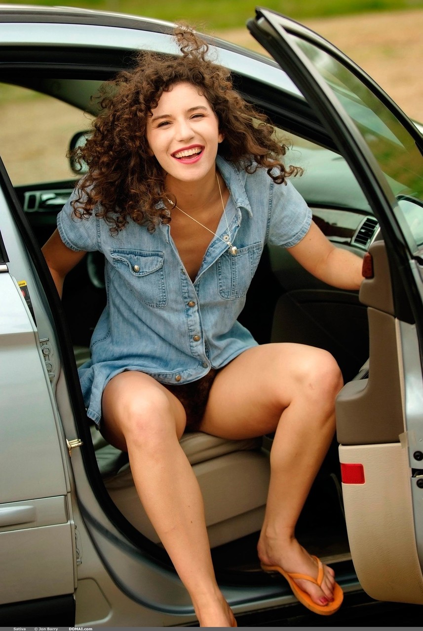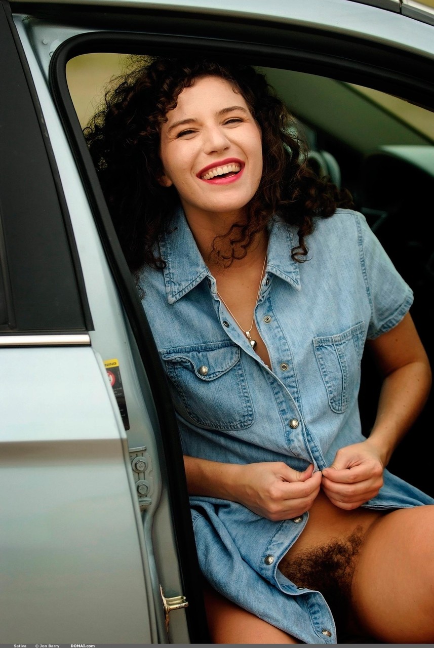 サティバのくちゃくちゃ髪の美女が屋外で毛深いマンコを見せる