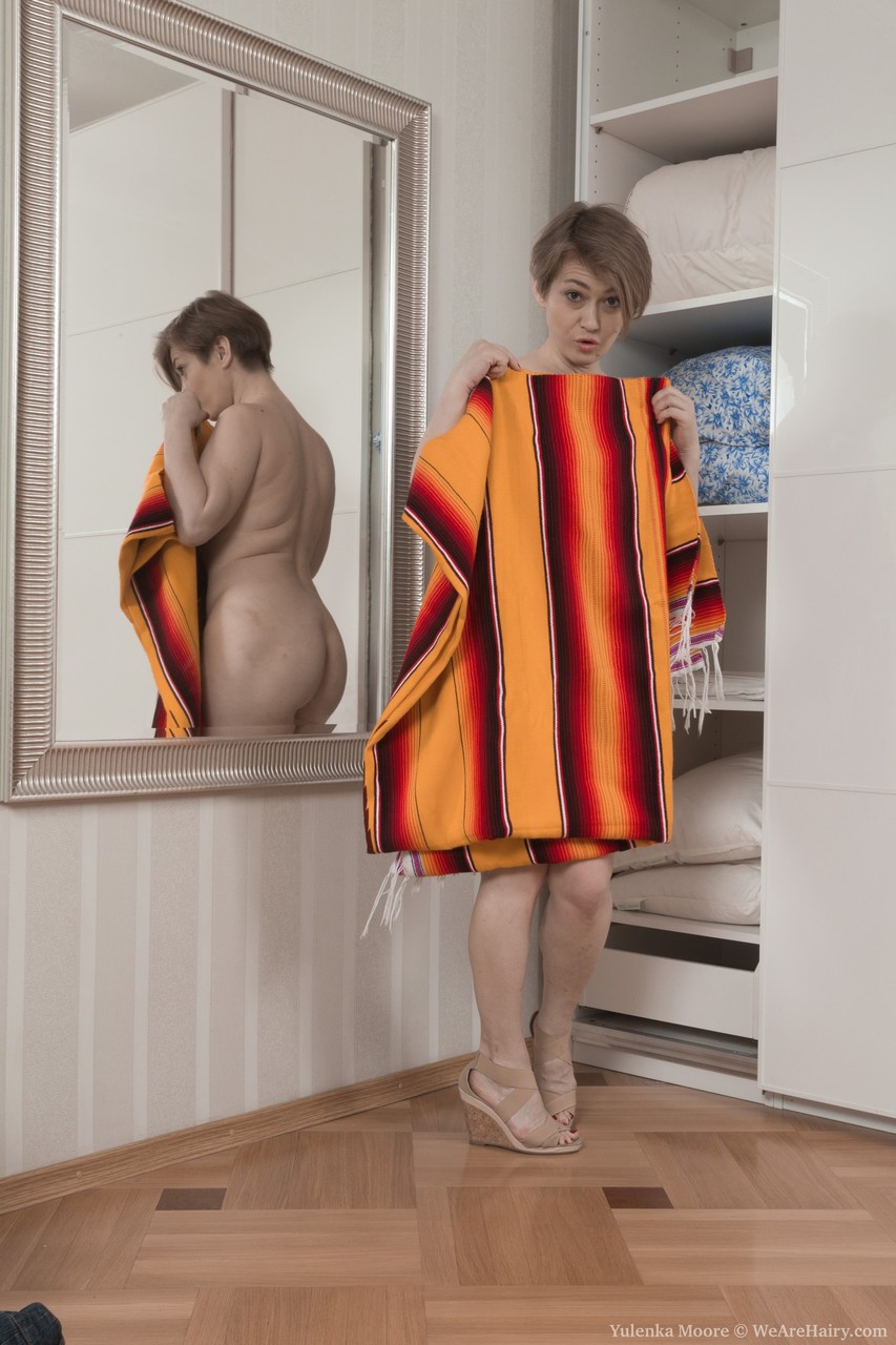 ぽっちゃりしたショートのユレンカムーアがドレッシングルームでストリップして毛Deepなマンコと戯れるクローズアップ - ギャラリー情報