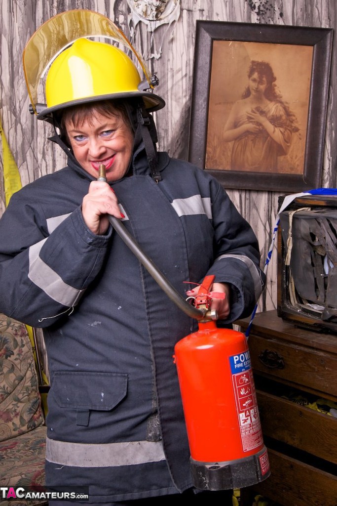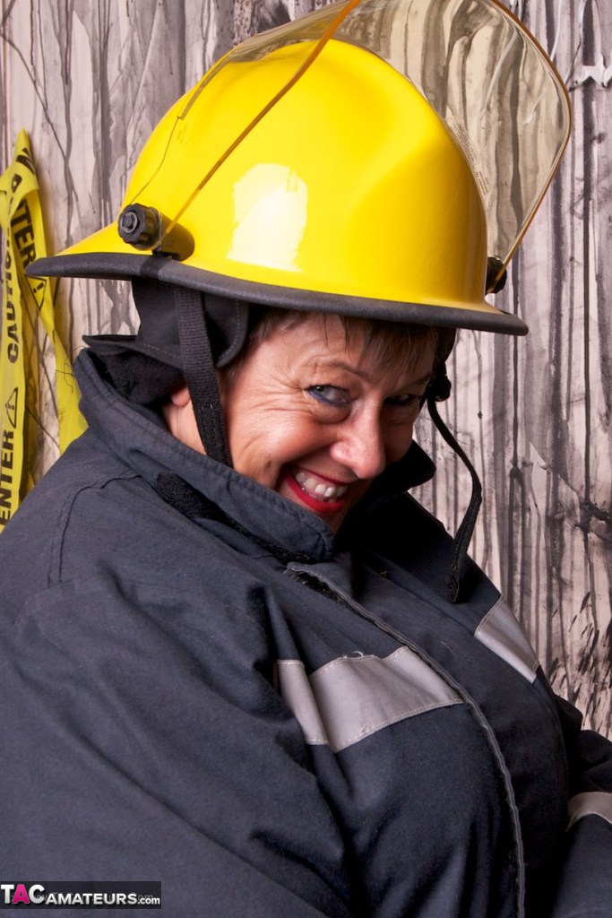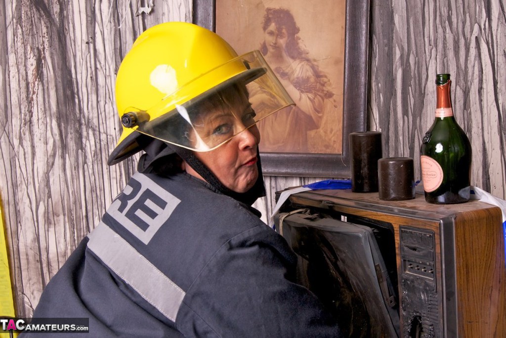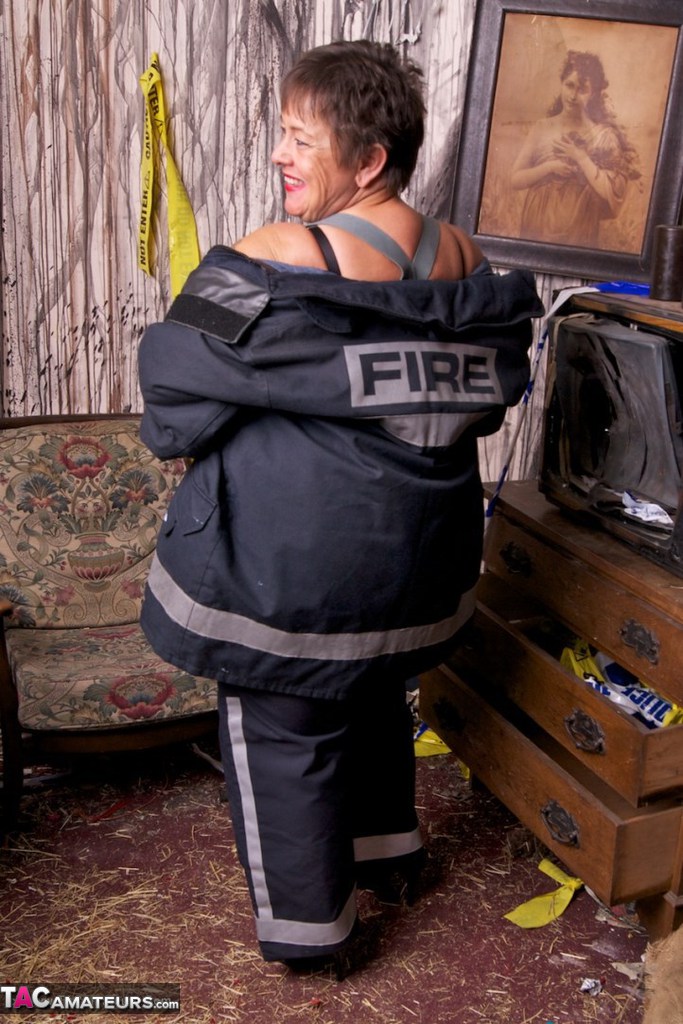 熟女デブが消防士の服を脱いで、パンティーストッキングを着たままマンコを見せる - ギャラリー情報