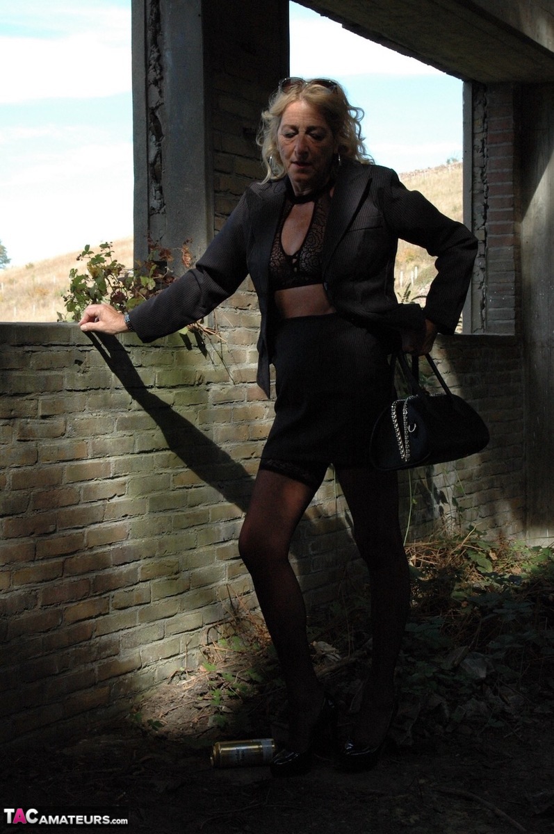セクシーな熟女ブロンドのKyraが屋外で黒スカート、ストレットヒール、ニーハイで挑発。60代以上好きの素人美熟女がストッキングとランジェリーで体を披露。