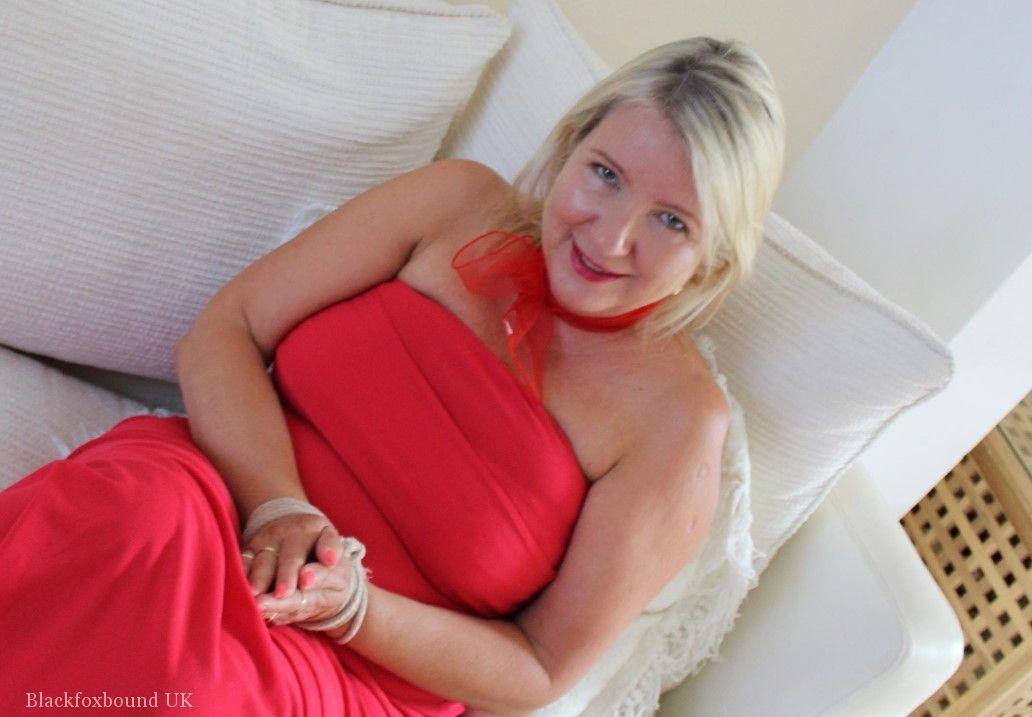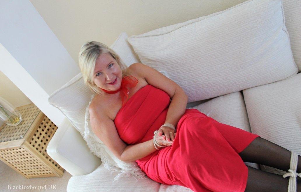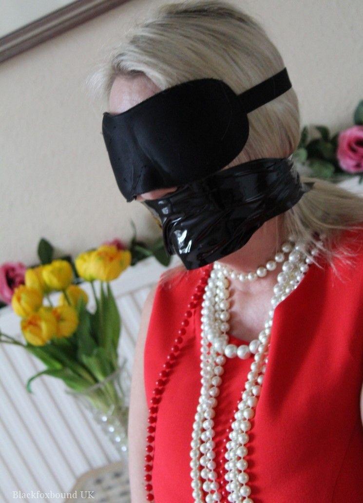 金髪の人妻が縛られて猿轡をされ、目隠しされてセクシーな衣装に身を包む