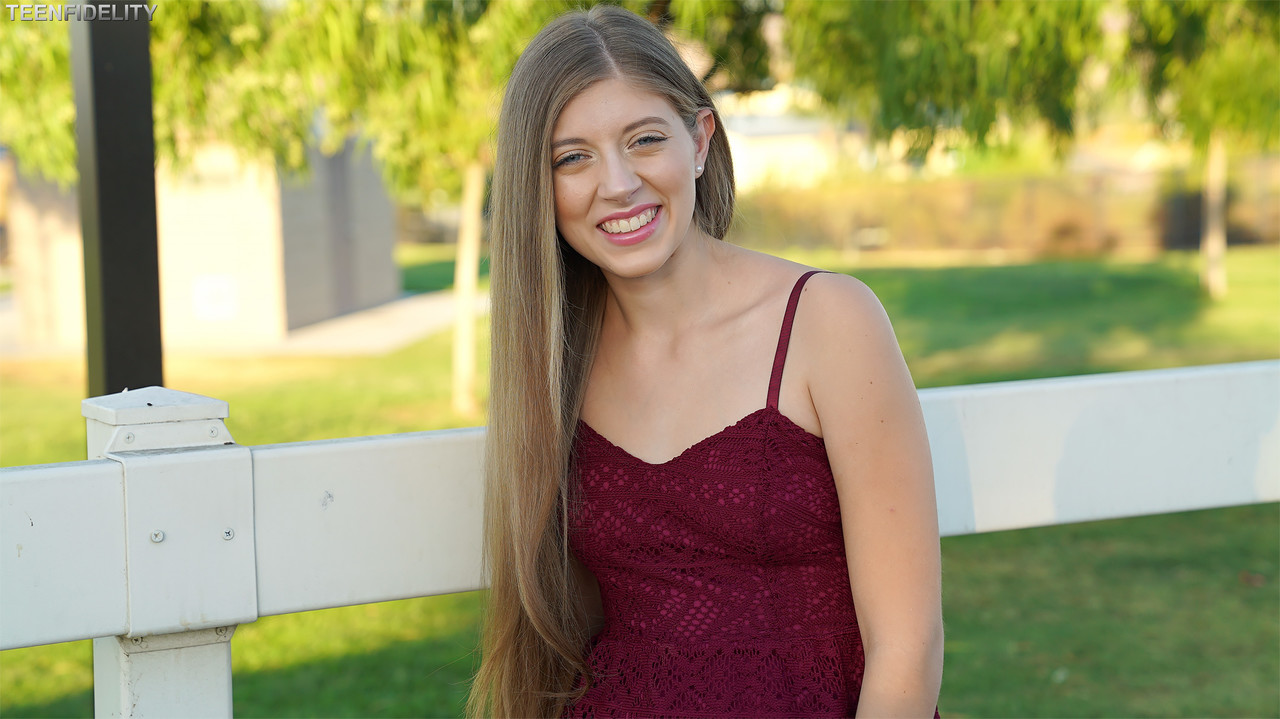 小柄なティーンAlyce Andersonが屋外でセクシードレスを着てポーズ