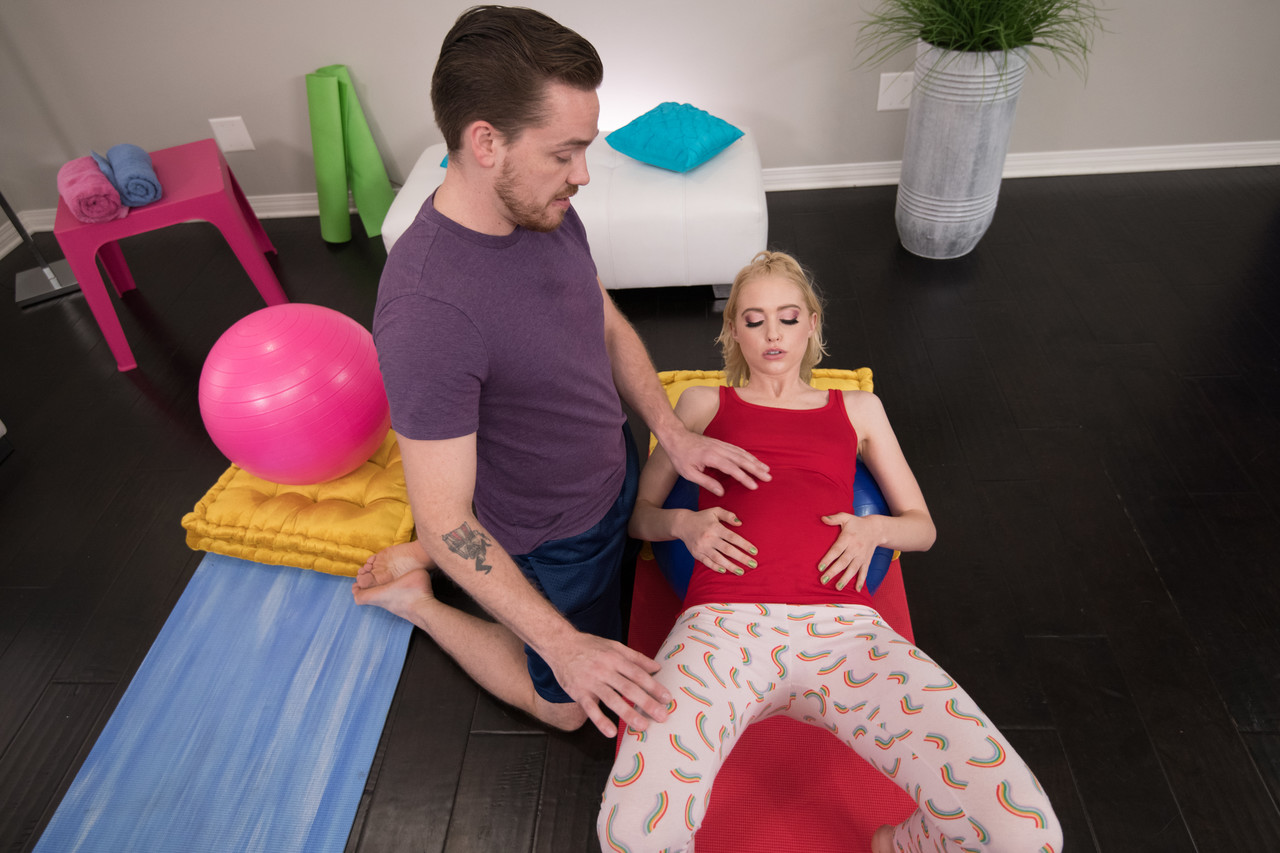 妊娠した10代のクロエ・チェリーはヨガパンツを履いたまま、インストラクターにきついお尻をストレッチしてもらい、レギンスに熱い射精でフィニッシュ。