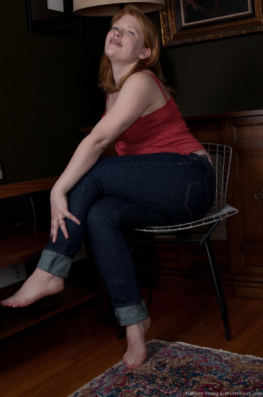 Madison Young, sexy ginger teen, flashes her big butt and hairy redhead pussy in a hot solo tease. Amateur PAWG strips from jeans, spreading ass and showing off her big tits and hairy twat.