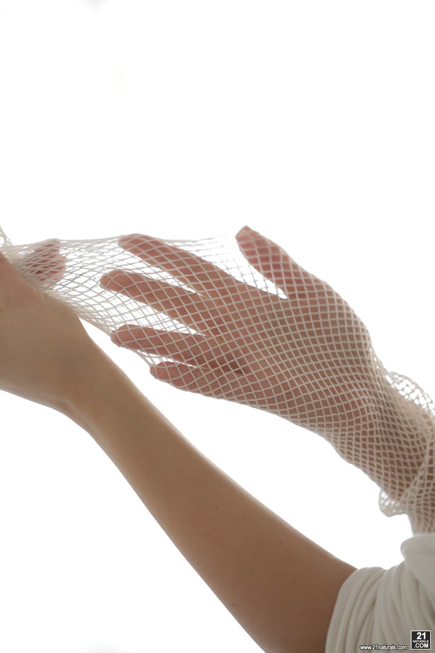 黒髪の裸足の美女ヴィッキー・ラブが完璧な足を愛撫し、網タイツを履く - 写真 11 / 17