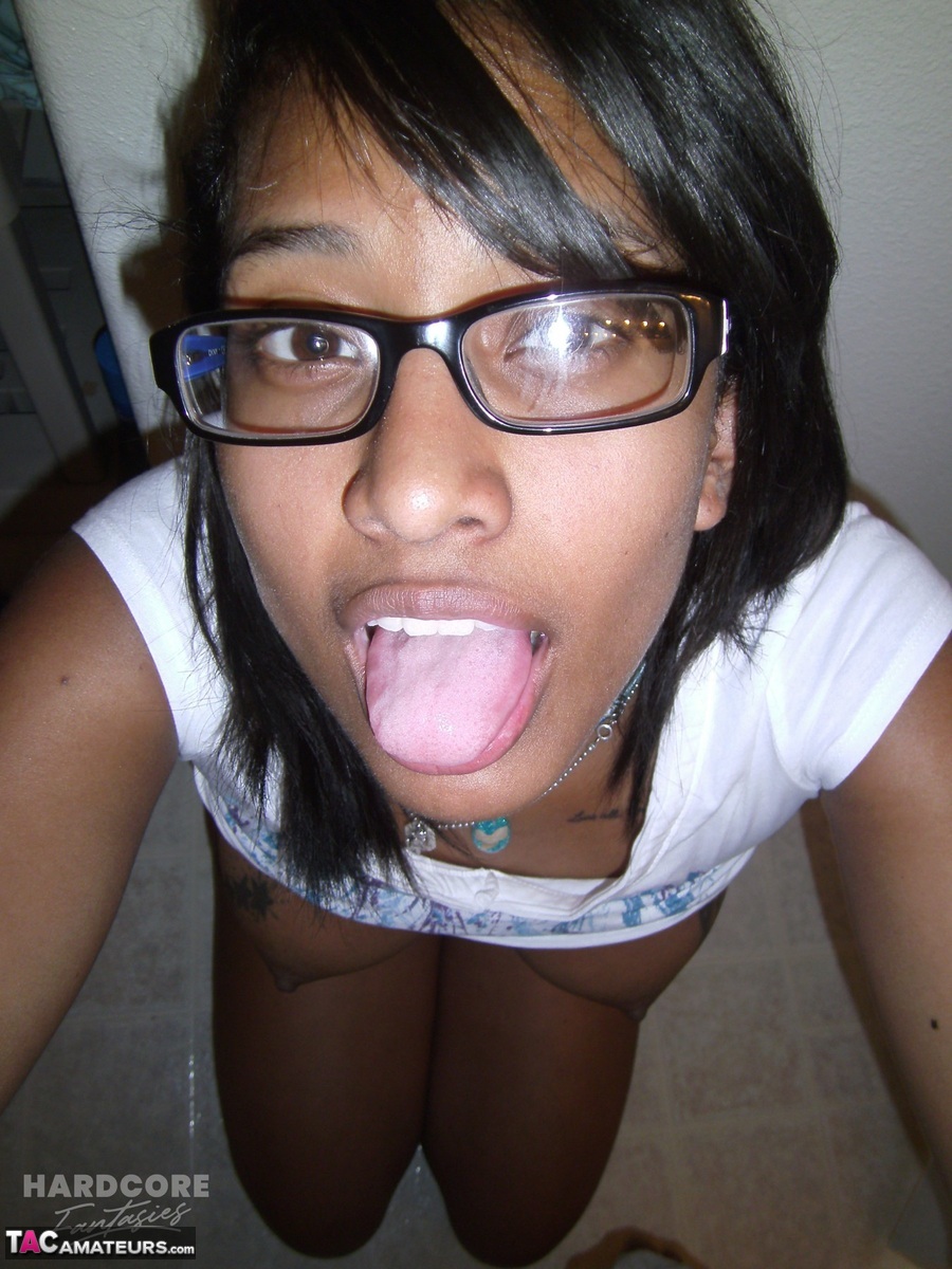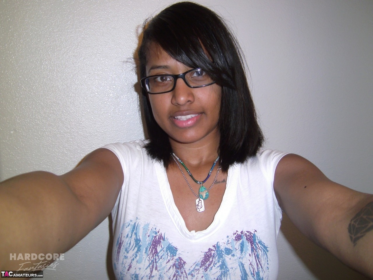 黒人素人娘が自宅で自撮り、大きな天然巨乳と剃った黒いマンコを接写で披露し、メガネとタトゥーをアピールして過激な素人ギャラリーに収める。