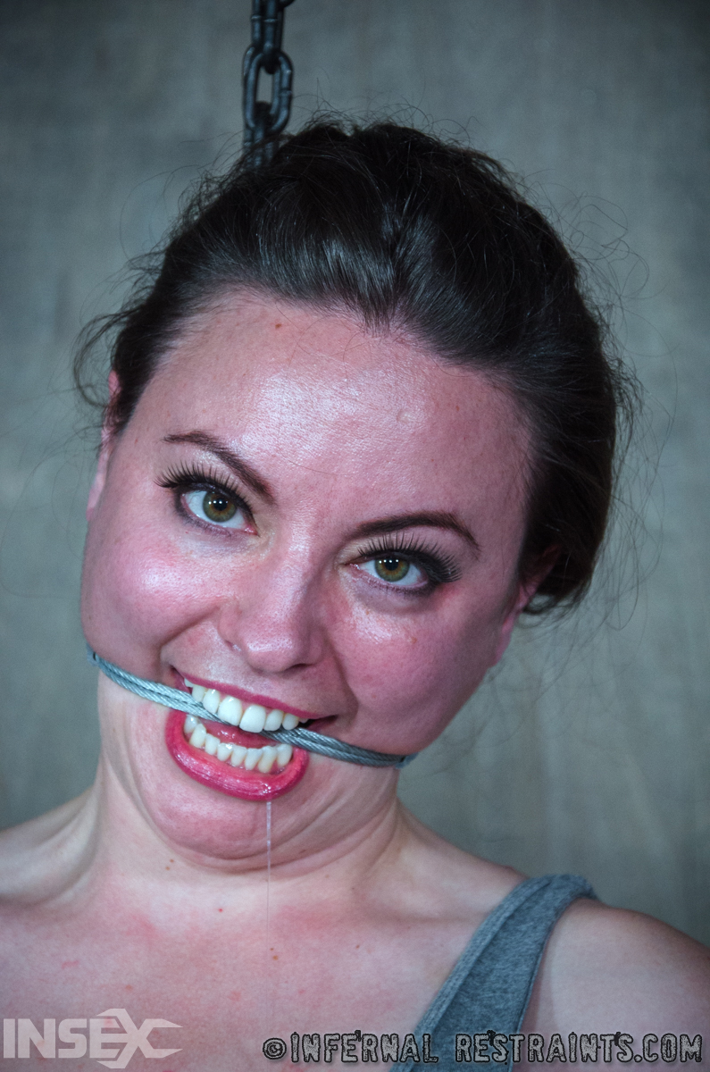 監獄の奴隷エイミー・ニコル、しっかりと縛られ、毛深い陰部が開かれ、小さな胸が挑発され、足と肛門が見え、近距離で撮影されたBDSMディルドプレイ。