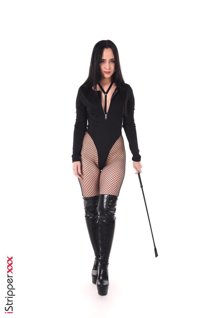 Dark-haired Brazilian beauty Alice Hernandez teases in leather lingerie, licking her riding crop while toy-fucking her Latina pussy in boots and pantyhose.