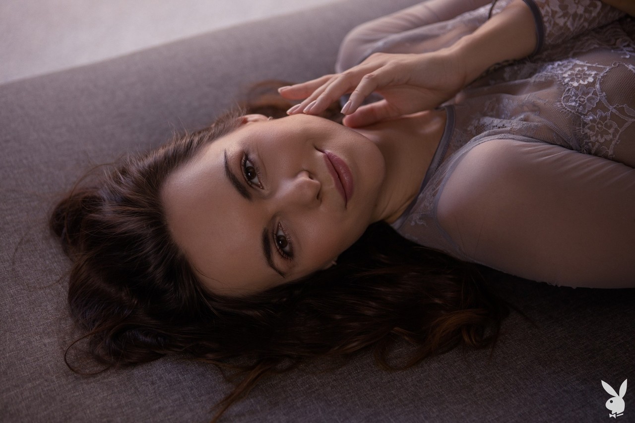 センターフォールドの美女ジャナ・ブブーがシースルーボディスーツを脱ぎ、大きな天然おっぱい、ランジェリー姿の美尻と長い脚を披露するスチームなソログラマーテイズ。
