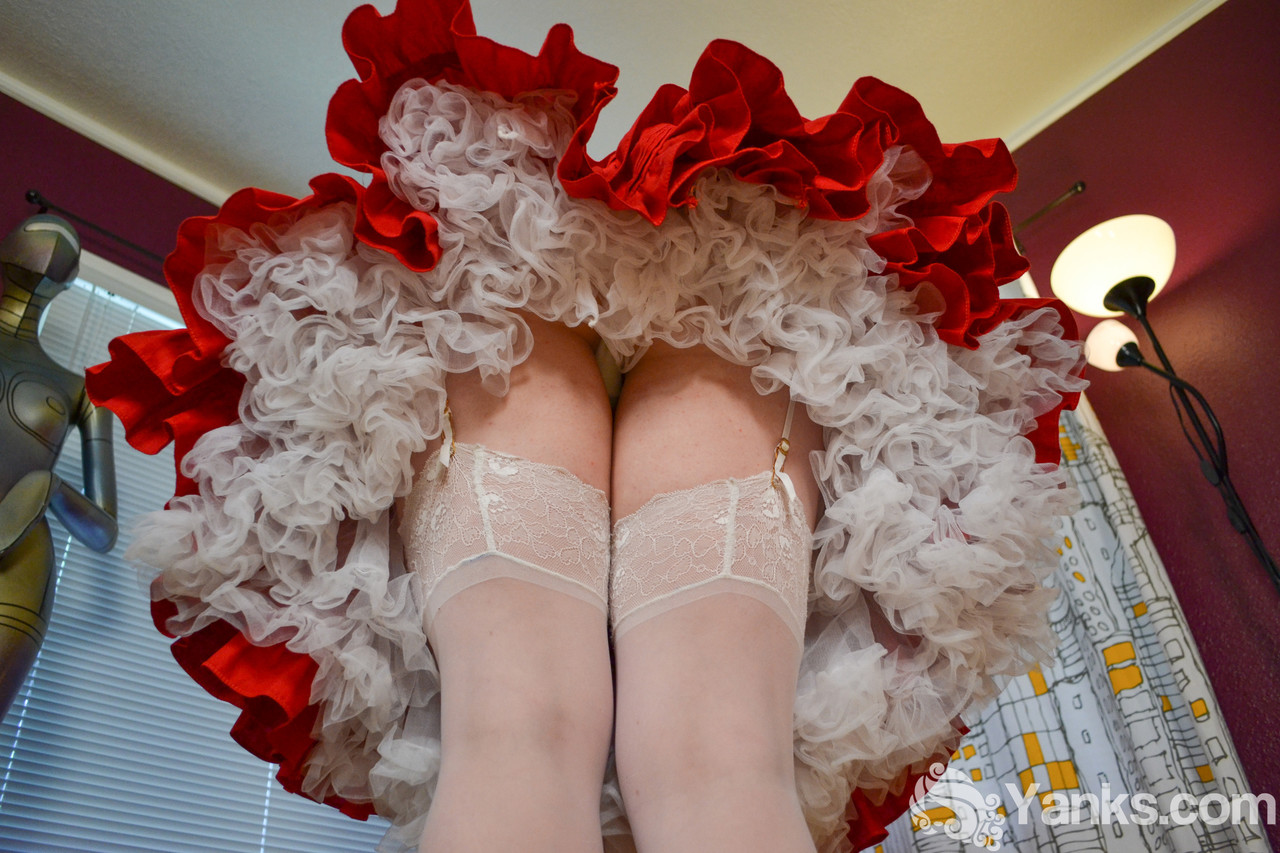 ヴィクトリア朝下着を着た金髪の美女が、ゆっくりスカートをめくり、レースのパンティとストッキングを脱ぎ、そしてインティメイトなクローズアップのソロ指オナニーを始める。