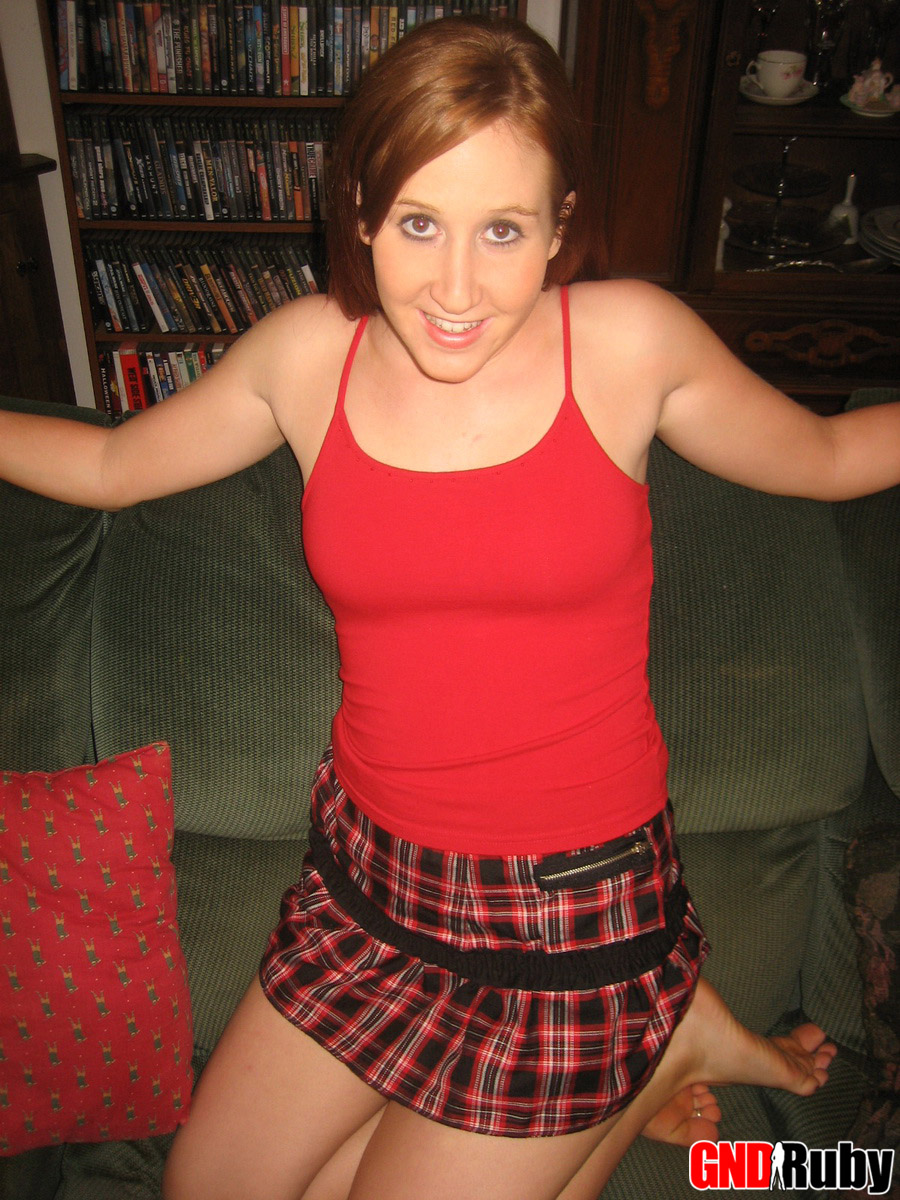 若い赤毛の少女が自然な乳房と股間をソファーで愛撫する - ギャラリー情報