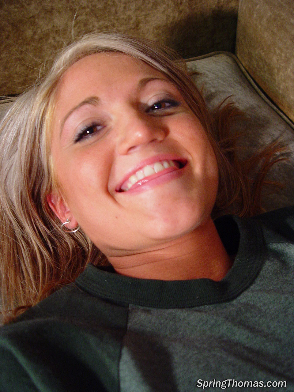Blonde teen Spring Thomas strips naked on the sofa, showing off her shaved pussy, long legs, and sexy feet in a hot solo spread session.