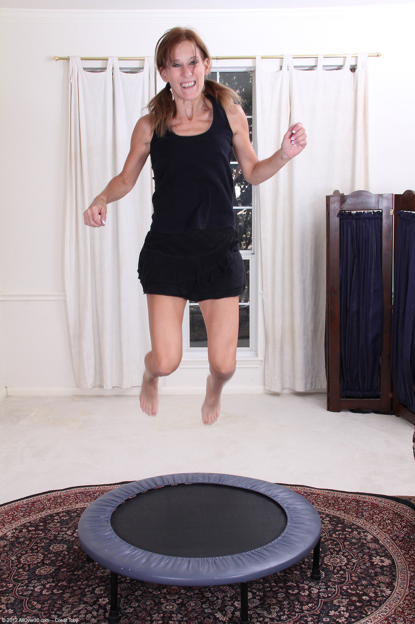 熟女の赤毛のJay Deeが室内トランポリンで飛び跳ね、服を脱ぎ、剃毛したオマンコを広げてアマチュアのソロショーで披露する