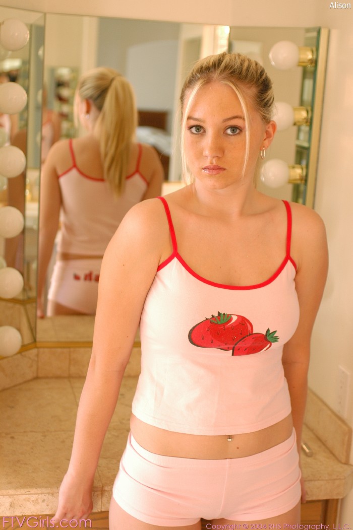 肉感的な十代アリソンが巨乳を見せてマンコの唇をこすります - ギャラリー情報