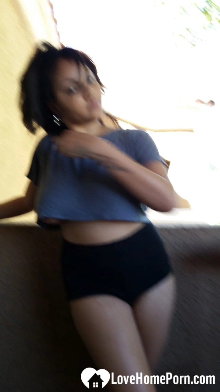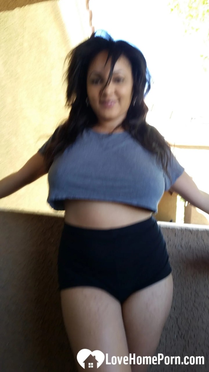 ぽっちゃり黒人素人がセクシーシャツでブラなしでバルコニーに