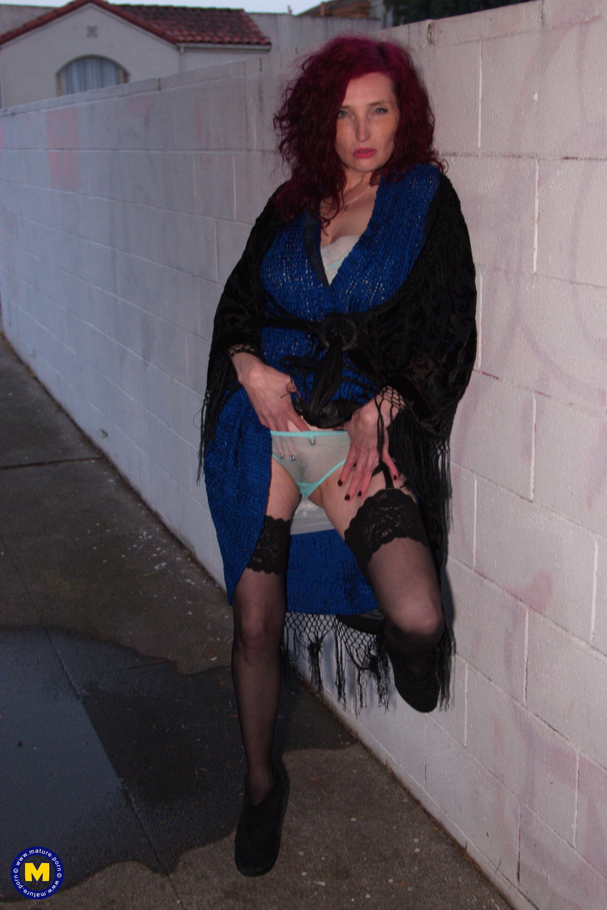 燃えるような赤毛の美熟女ジニア・ブルーが黒ストッキングで挑発、野外で熟したマンコと巨乳を開いてあなたが渇望する素人ユーロフラッシュを見せつける。