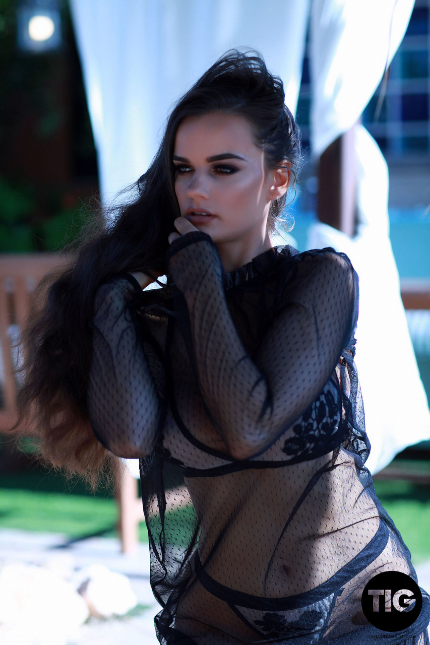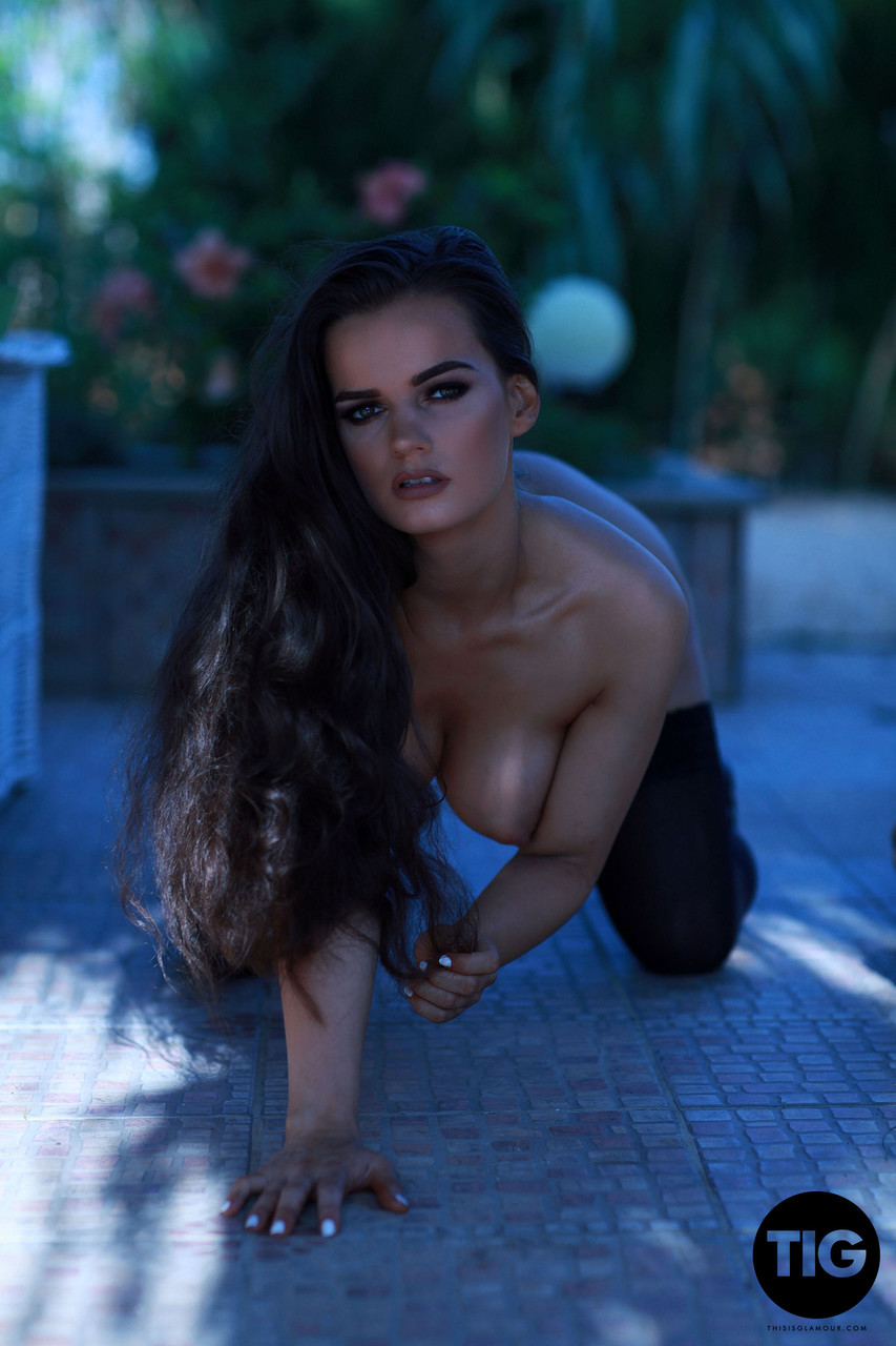 Ashley White, busty MILF pornstar, teases in sheer stockings and lace lingerie, flaunting her fake big tits and erect nipples in glamorous European nude shoot.