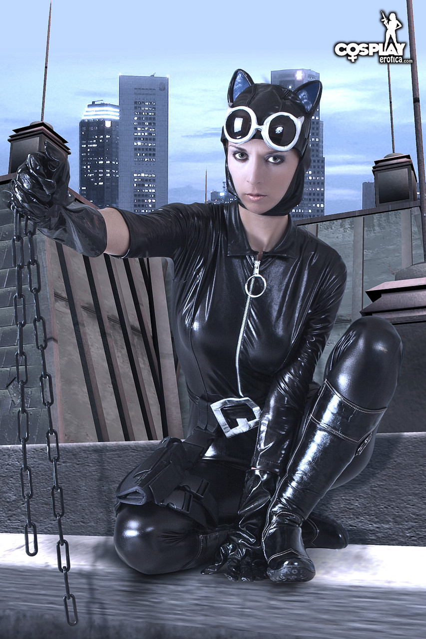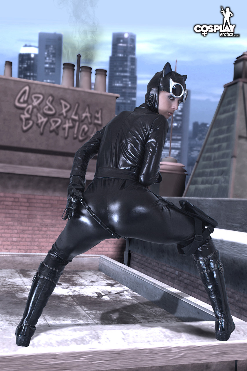 猫女コスプレが月光に照らされた屋根から密な皮革を脱ぐ、コスプレの尻、巨乳、ブーツを挑発する前に最後の糸まで脱ぎ捨てる。