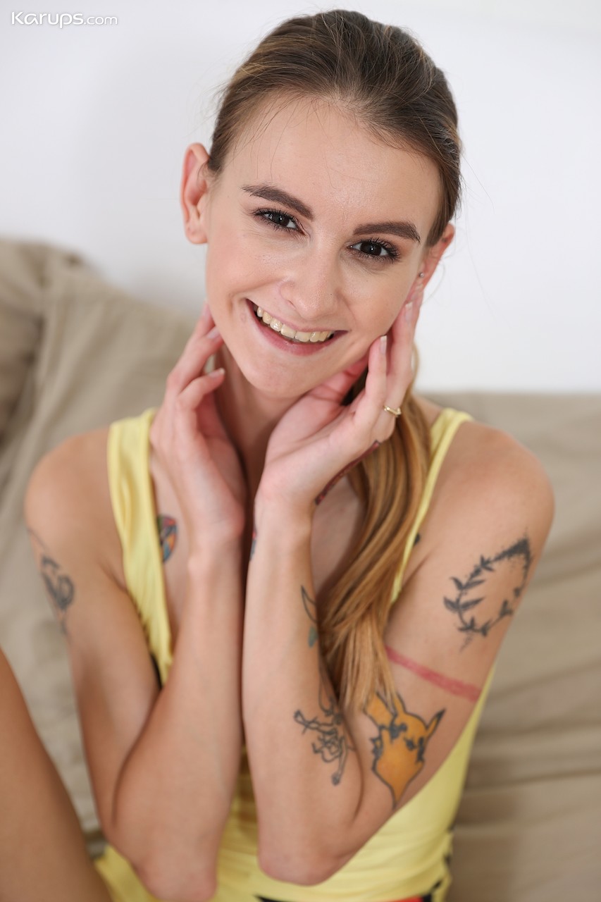 細いタトゥーのあるティーンモデルアデルユニコーンフラッシュ毛むくげとおもちゃをベッドの上で - ギャラリー情報