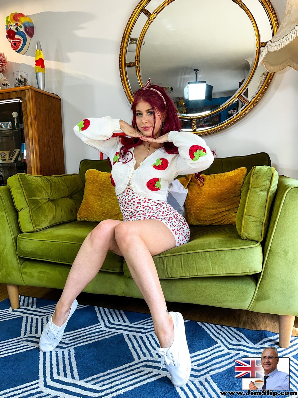 情熱的なイギリス人赤毛アトランタ・モレノがスカートとパンティーで挑発し、巨乳、丸いお尻、丸剃りマンコをアップスカートで披露してから大きく開脚。