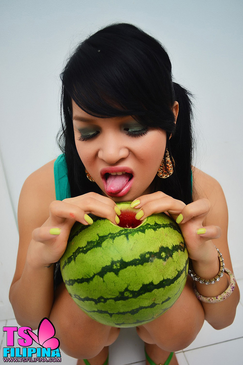 小さなチンポを持つドスケベ黒髪ニューハーフがパンティで誘惑、爆乳と美ボディを披露しながらスイカで自分を楽しませる単独ニューハーフ美女セッション。