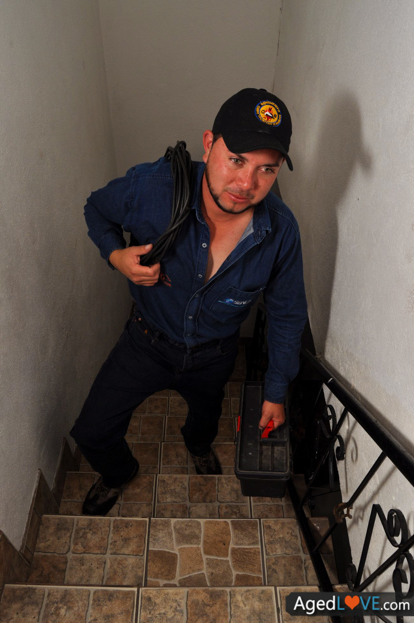 豊満なブラUNETグラニー・アンドレアは、ランジェリーを着たケーブルガイを誘惑し、彼の大きなペニスに乗り、最後に彼女の垂れ下がったBBWの乳房に精液を受け取ります。