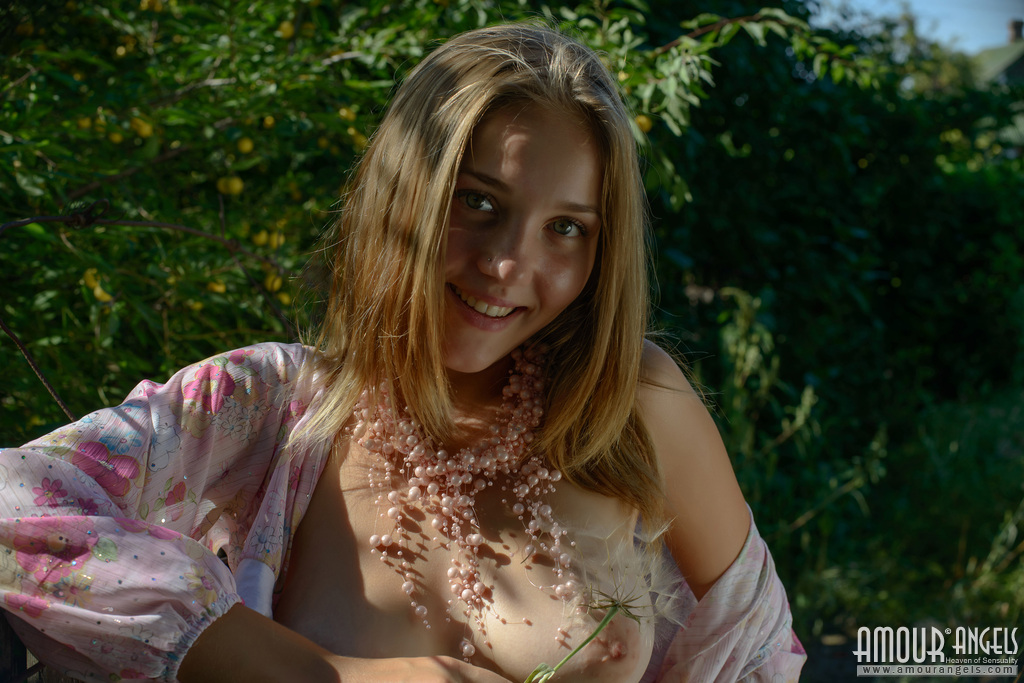 若い金髪のアナステジアが屋外でストリップを見せ、かわいい乳房や少女の恥毛を見せつつ、広い脚を開いてお尻を広げ、乳首を挑発する。