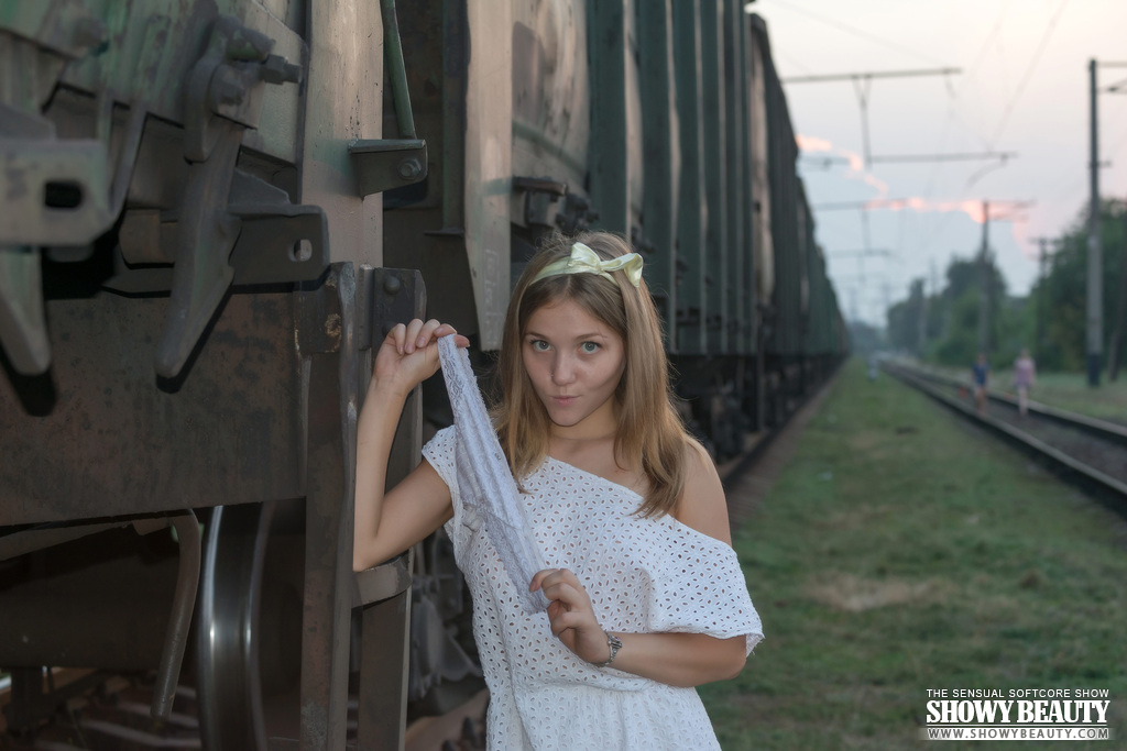 美しい十代のダリナBが白いショートパンツを脱いで屋外で裸でポーズを取る