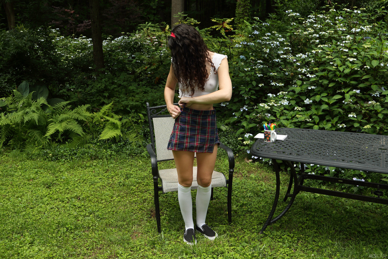 激やせ制服少女リズ・ジョーダンが野外で開脚、締まったマ○コと開いたアナルにマーカーを深く挿入しながらスニーカーとソックス姿で天然おっぱいを披露。