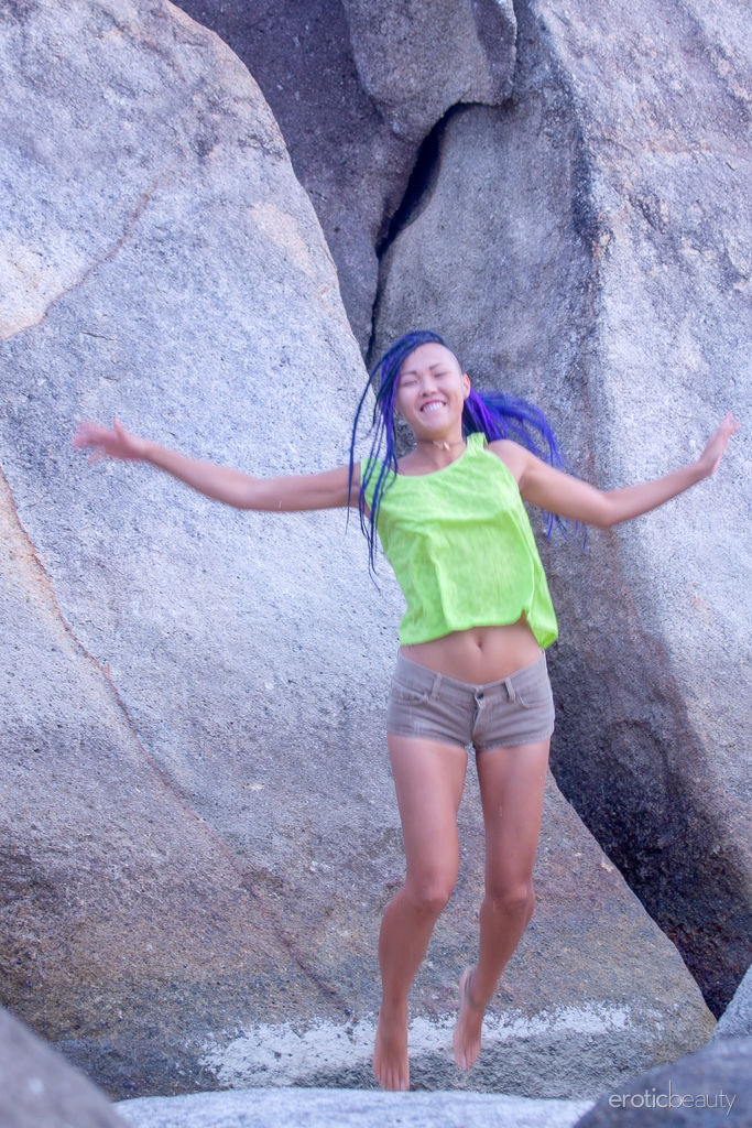 かわいいアジアのティーンエイジャー、ジュリーは、人里離れた海岸で全裸になり、剃毛したおまんこ、ピアスされた乳首、および愛らしい足を日光にさらす。
