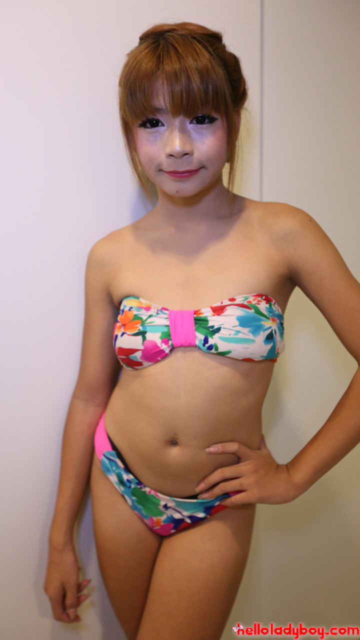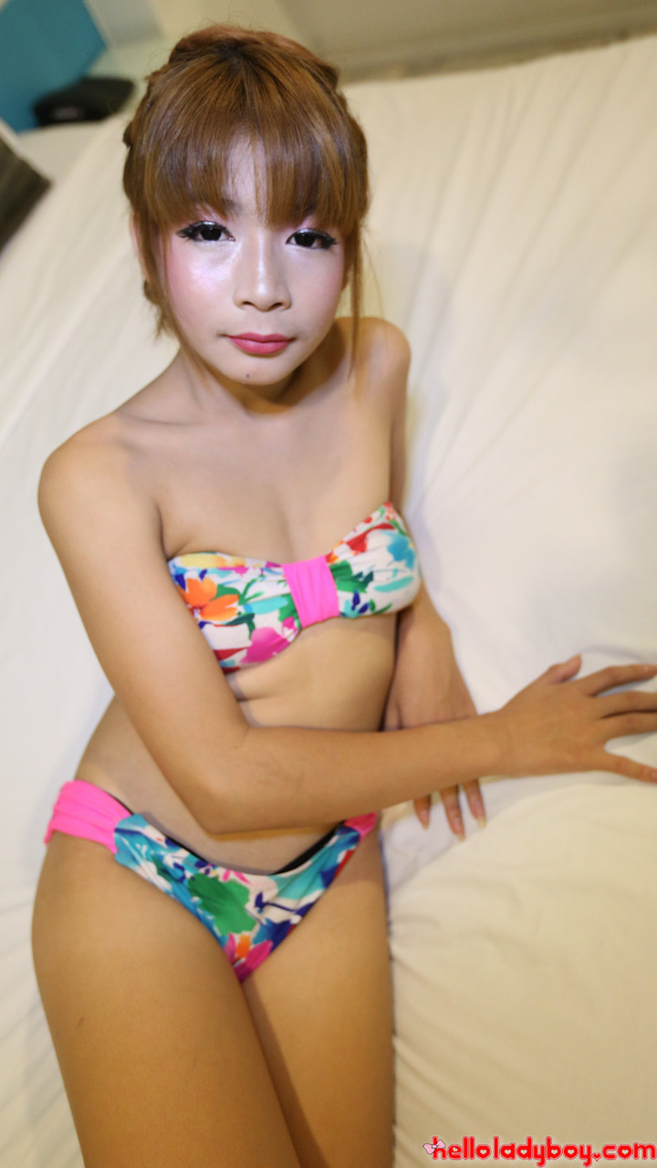 小柄なアジア系シーメールがセクシーなランジェリー&ビキニで挑発、彼女のニューハーフ曲線とトラニー魅力を独占ギャラリーで披露。