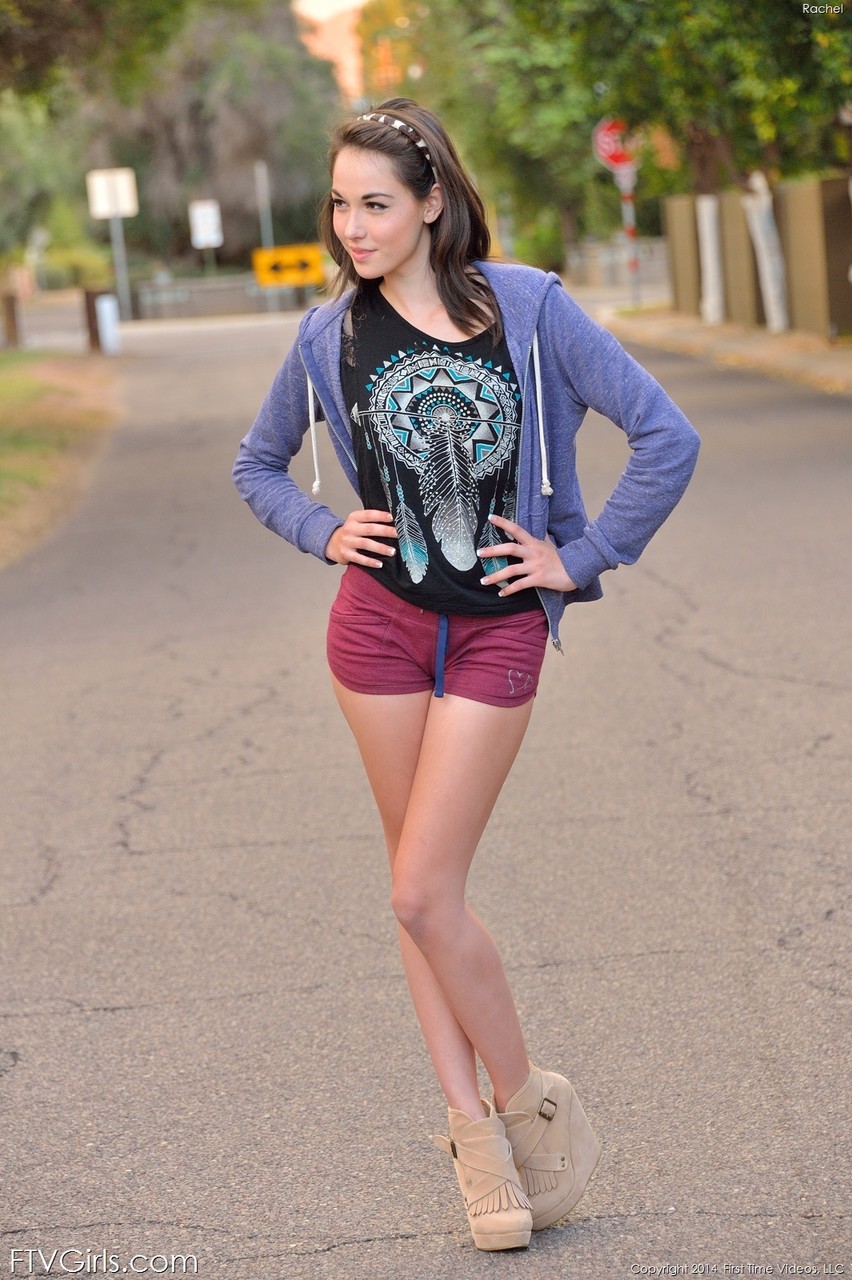 スレンダーな素人ティーン・レイチェルがゆっくりと服を脱ぎ公衆の場でポーズを取る