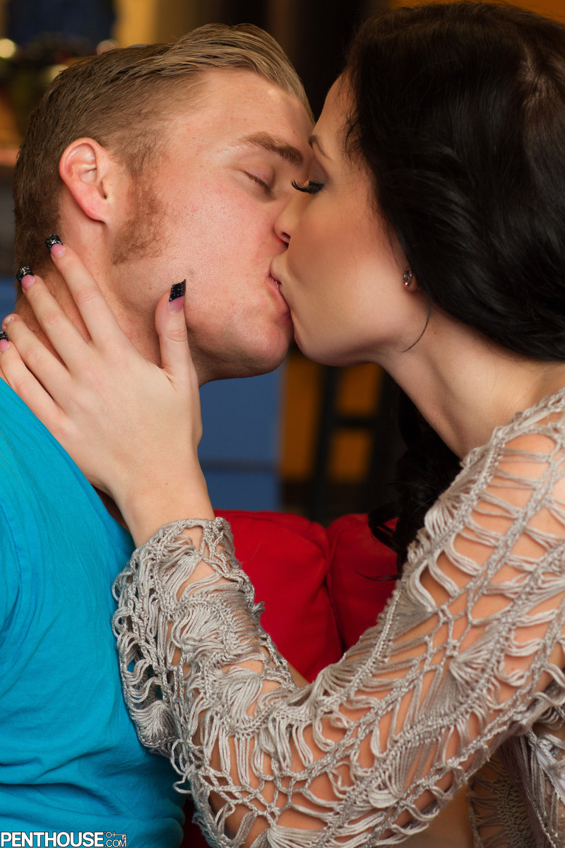 センターフォールドモデルAria Aspenが赤いソファで男と情熱的なキスと激しいハードコアセックスを共有し、ドロドロの中出しフィニッシュ。