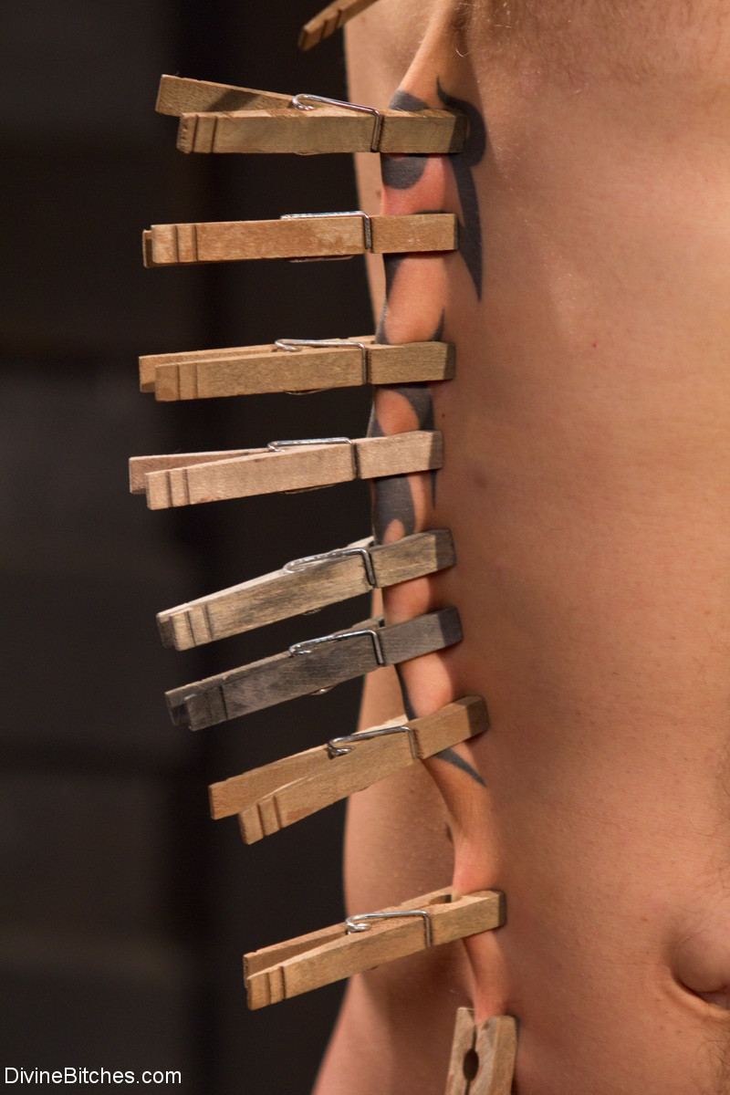 Dominatrix Lorelei Lee shackles her male sub with clothespins, forcing him to worship her boots in intense femdom BDSM bondage session. MILF mistress delivers humiliation, handjob and domination.