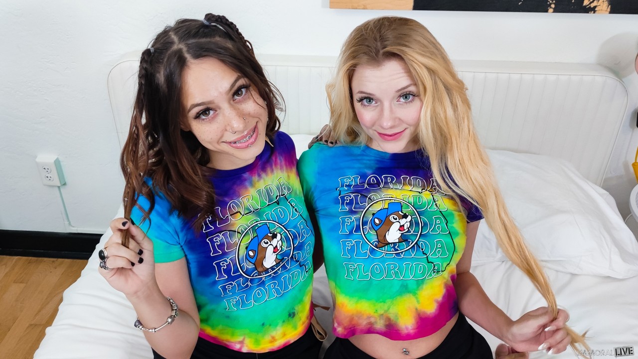 可愛いティーンRiley StarとLaya Raeがベッドで全裸になり、POVリアリティシーンでピンクのオマンコとスレンダーなお尻を広げ、自然な微乳とラテン風情を披露。