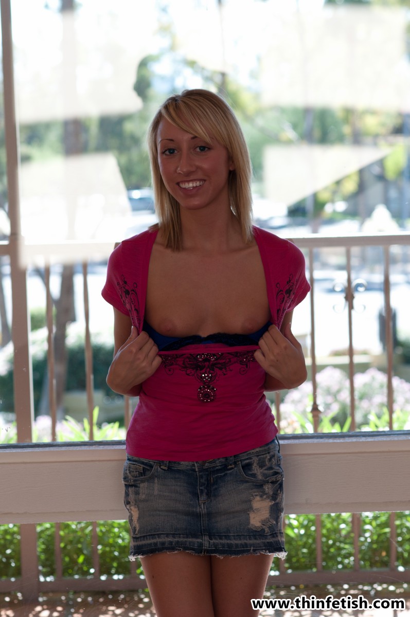 Blue-eyed blonde babe strips jeans and skirt on public balcony, flashing shaved pussy upskirt with no panties, gaping open for daring solo fetish tease.