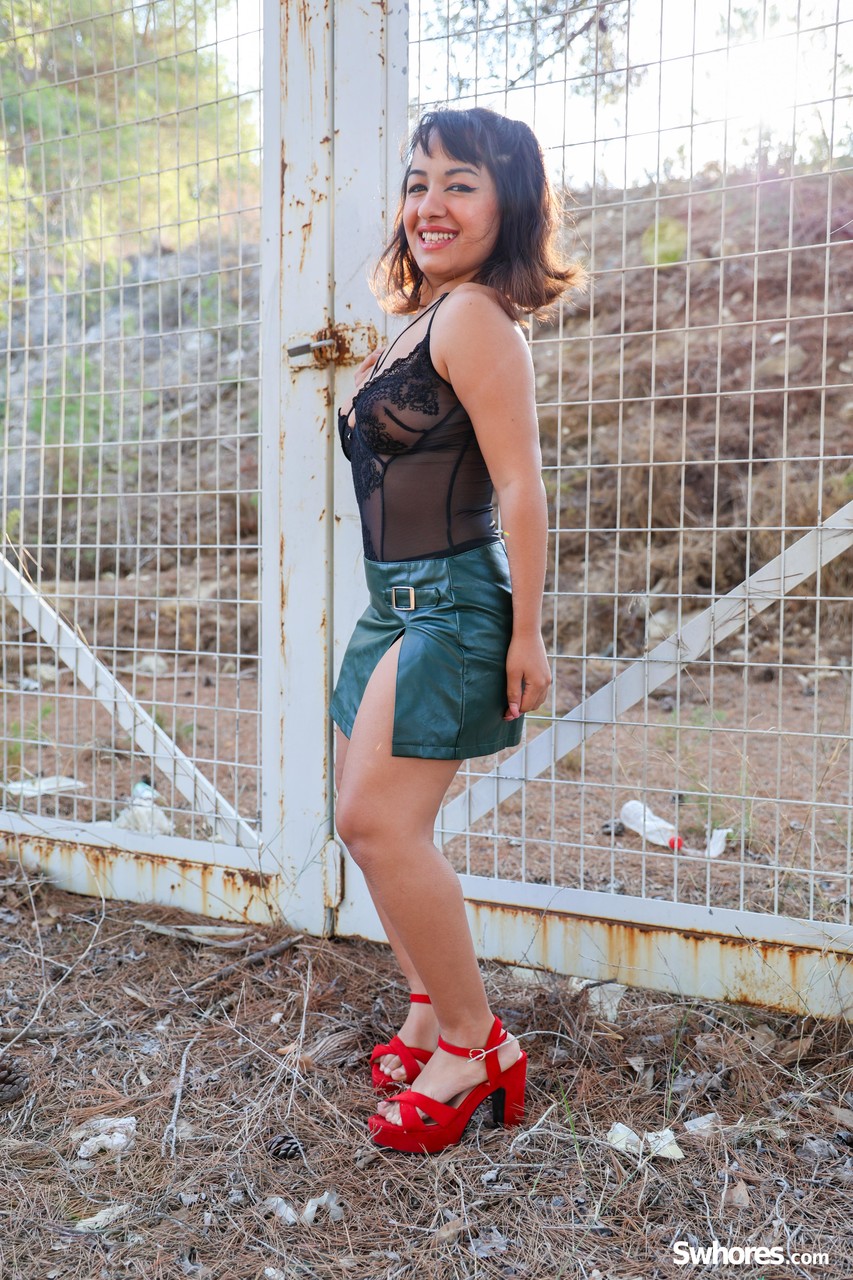Angry Latina Munequia lifts her skirt, teasing POV with bare pussy, then unleashes big tits for deepthroat before squat-riding cock hard outdoors.