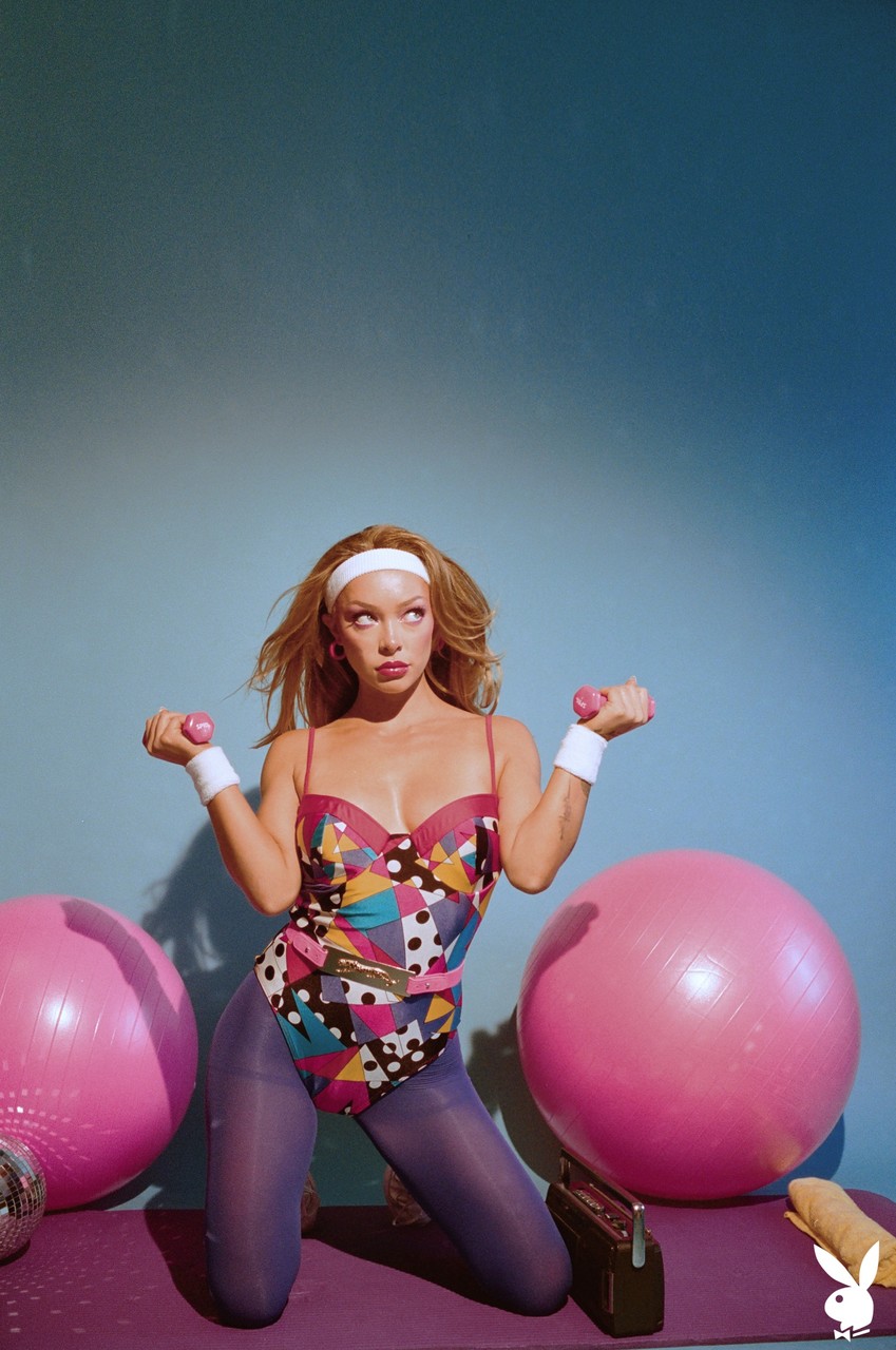 Attractive redhead fitness model Aubrey Destremps slowly teases her natural tits and perfect ass in sporty uniform—glamorous centerfold babe with beautiful legs and non-nude glamour.