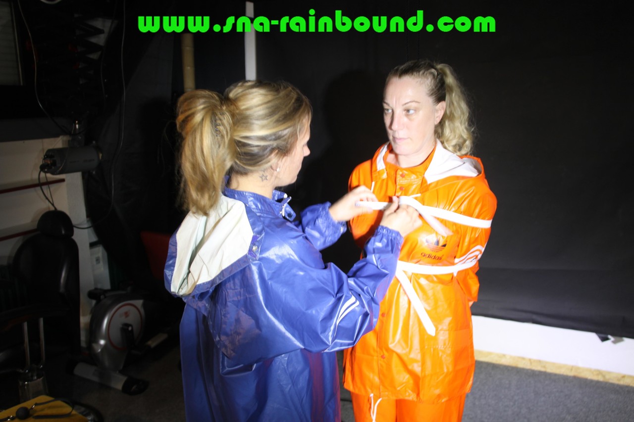 Gagged White Girl Tied Up In Lesbian Nylon Rainwear Domination