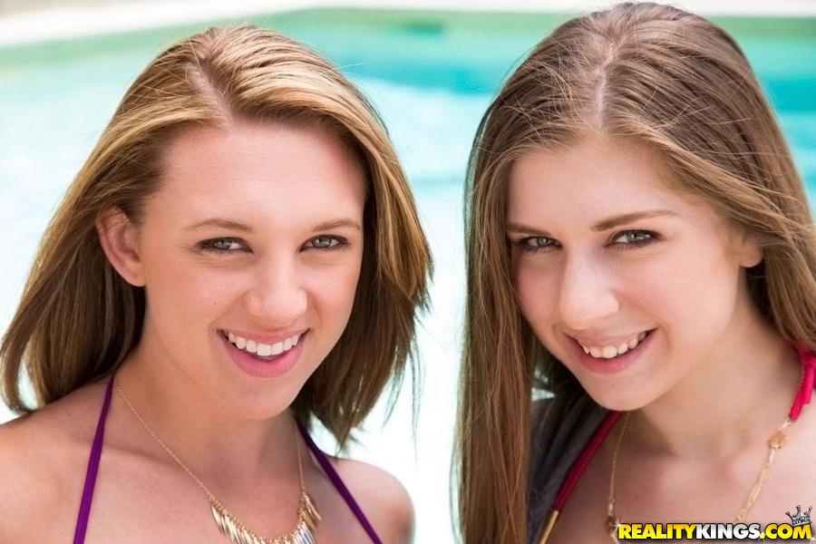Busty lesbians Alex and Brooke heat up the poolside, their big wet natural tits slipping free as they kiss and grind in steamy outdoor hardcore action.