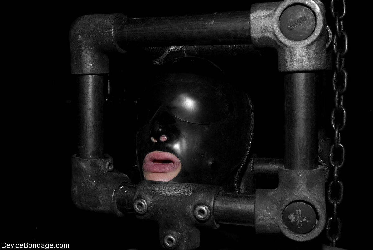 Device Bondage gallery: Damon Pierce dominates busty Penny Barber in latex, BDSM restraints, lingerie, dildo play, close-up big fake tits, feet, panties.