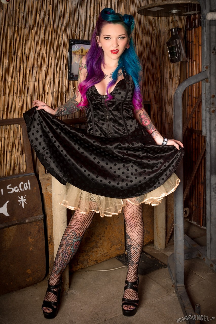 Tattooed babe Kandy Kummings teases in fishnets and heels, spreading her big-tits lingerie skirt to flash pussy and long legs.