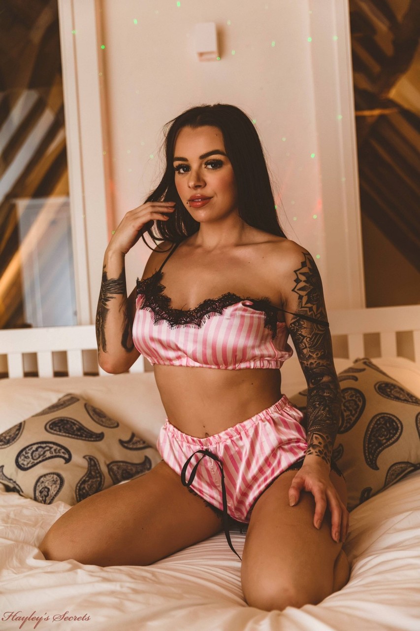 Tattooed brunette babe Mia Stryker slips off her lingerie on the bed to proudly show her enhanced big tits and inked curves in a steamy solo tease.