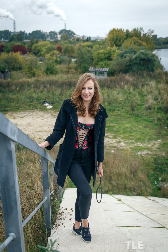 Horny blonde teen Amanda R. spreads her meaty pussy lips outdoors, sinking two fingers deep inside for an intense glam masturbation session.