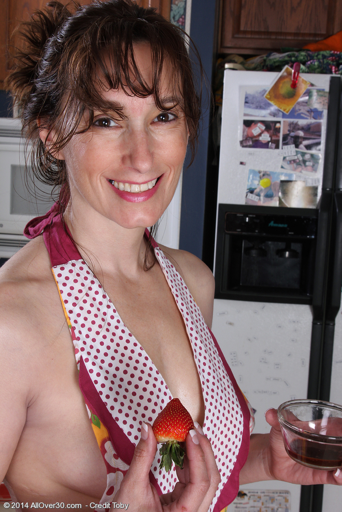 Nude middle-aged Celeste Carpenter strips off her kitchen apron, spreading her mature brunette pussy and tiny tits close-up before riding a dildo.
