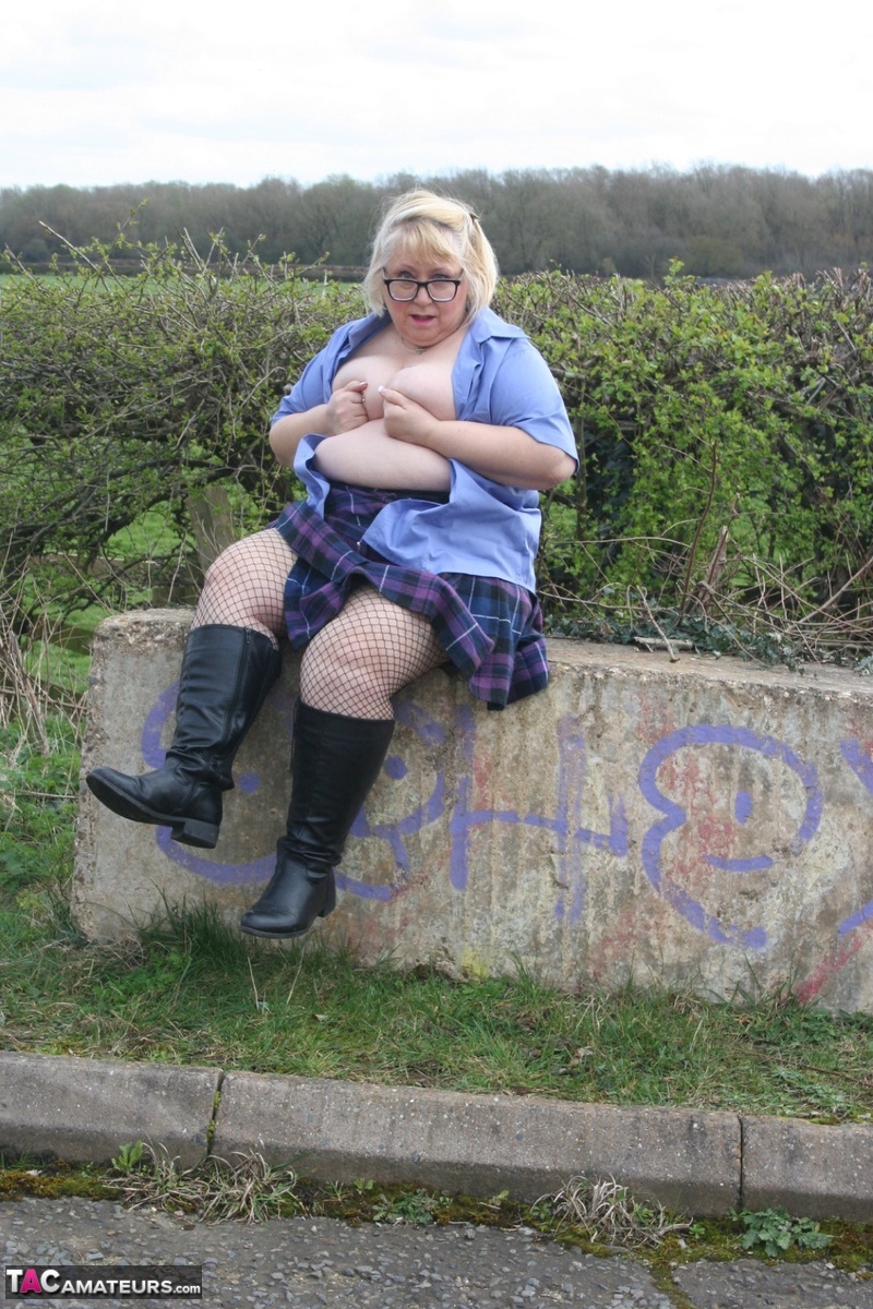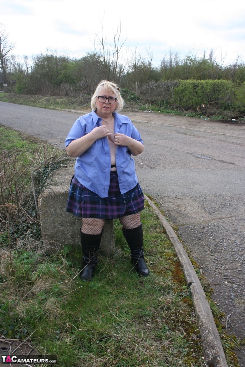 Mature BBW Lexie Cummings, a curvy British amateur, flashes her saggy tits and fat pussy on a rural road in boots, showing off her thick chubby body and fat ass in this mature upskirt gallery.