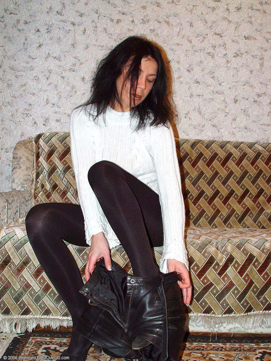 Olena XXX flaunts her mature MILF body in sheer pantyhose, spreading her pussy and cameltoe for All Over 30 fans craving natural tiny tits, high heels, and older women.